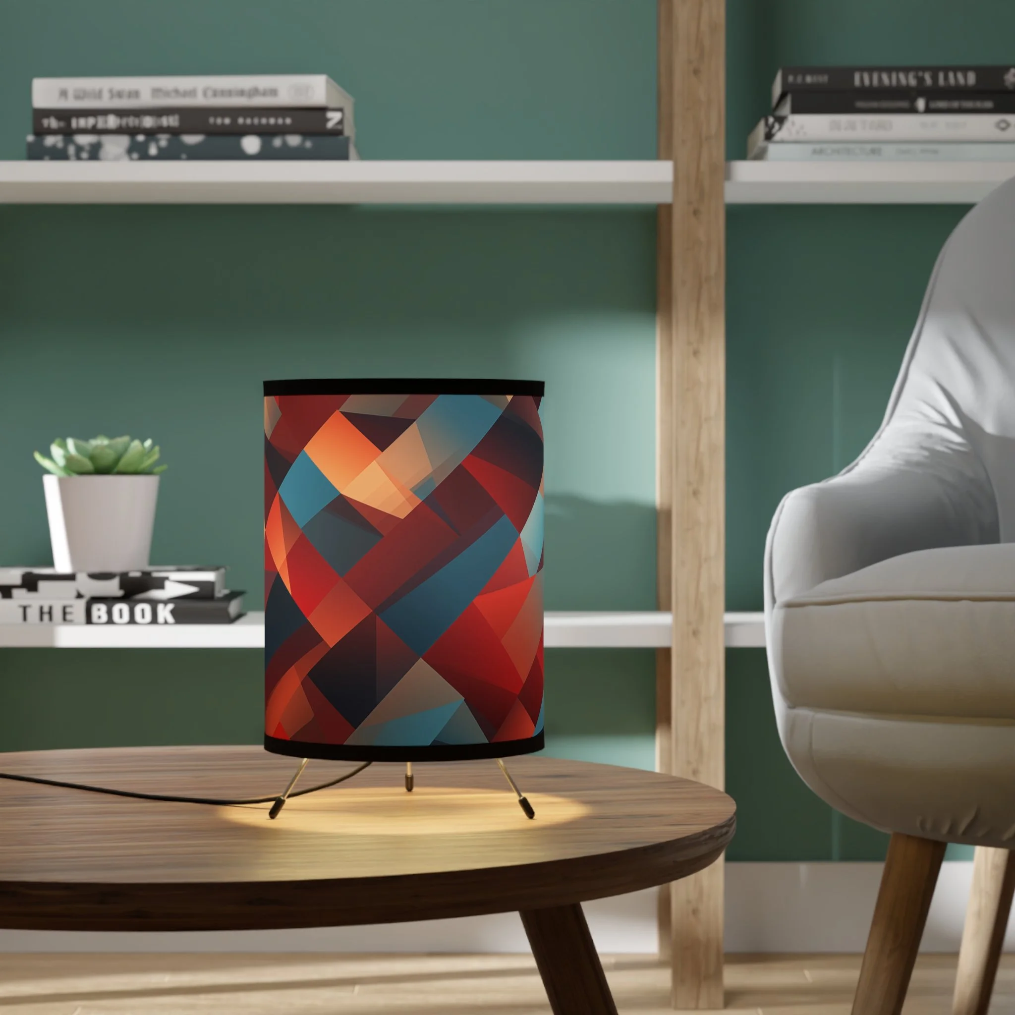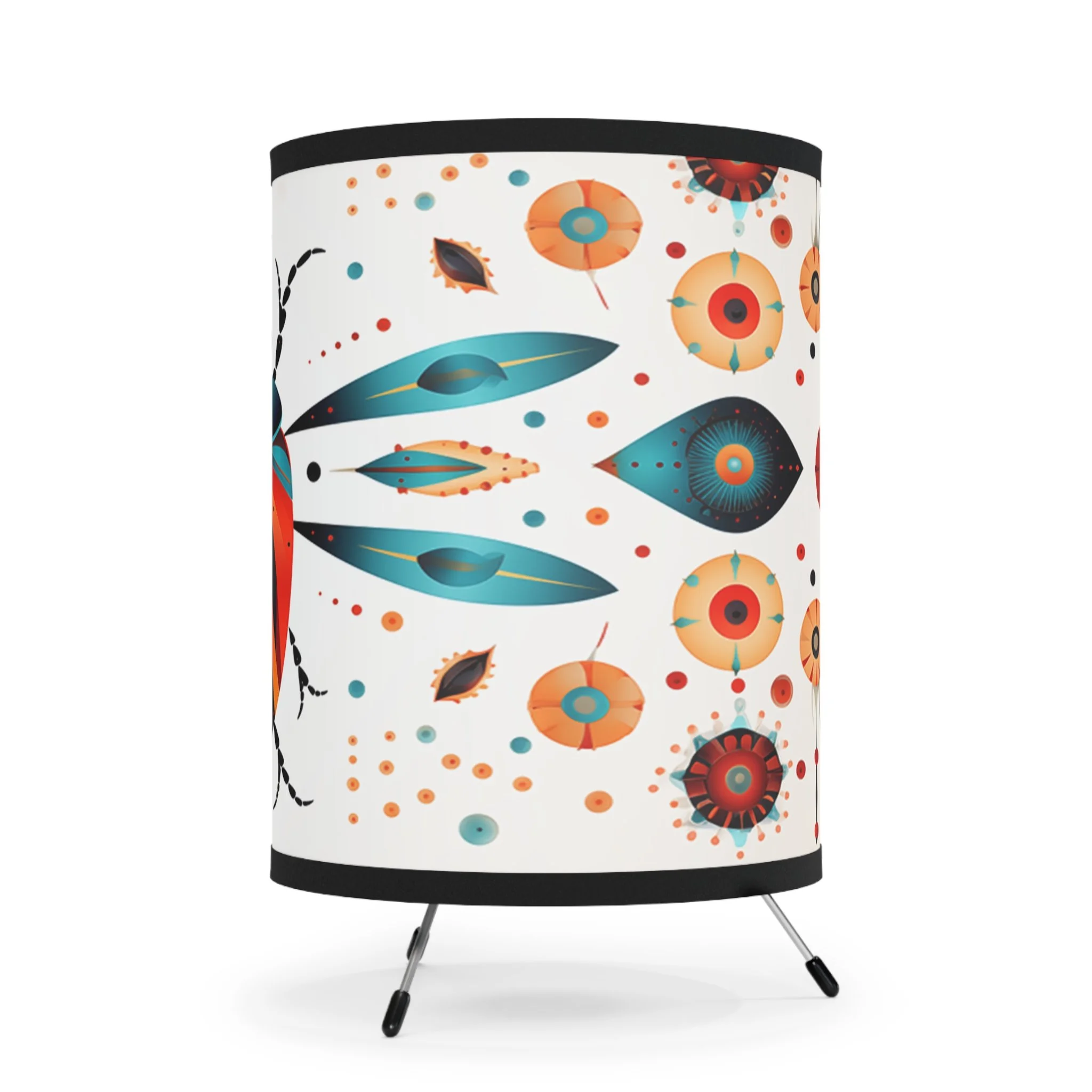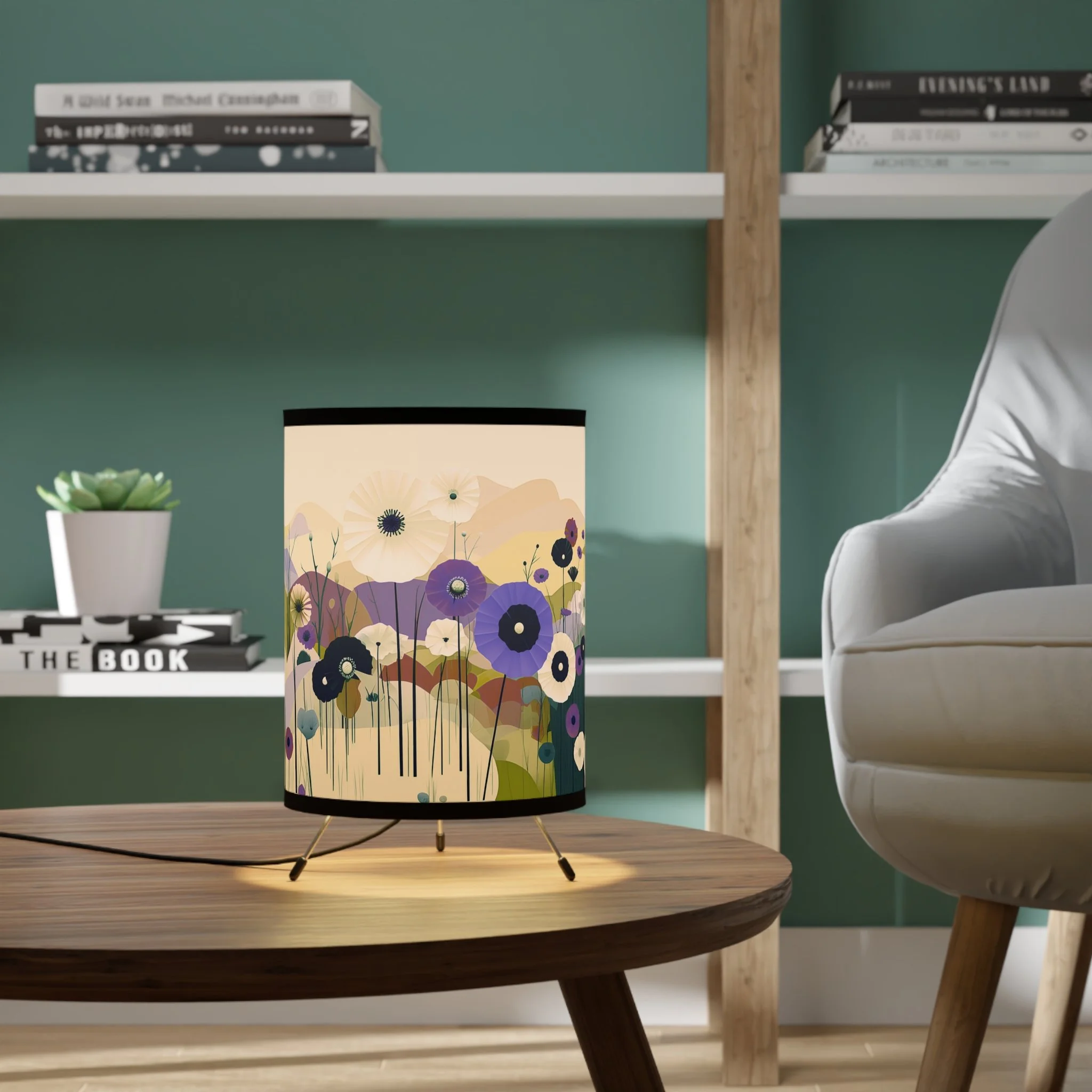 Add modern art and warm ambiance to any room with our tripod tabletop lamp featuring exclusive Design Motel artwork.