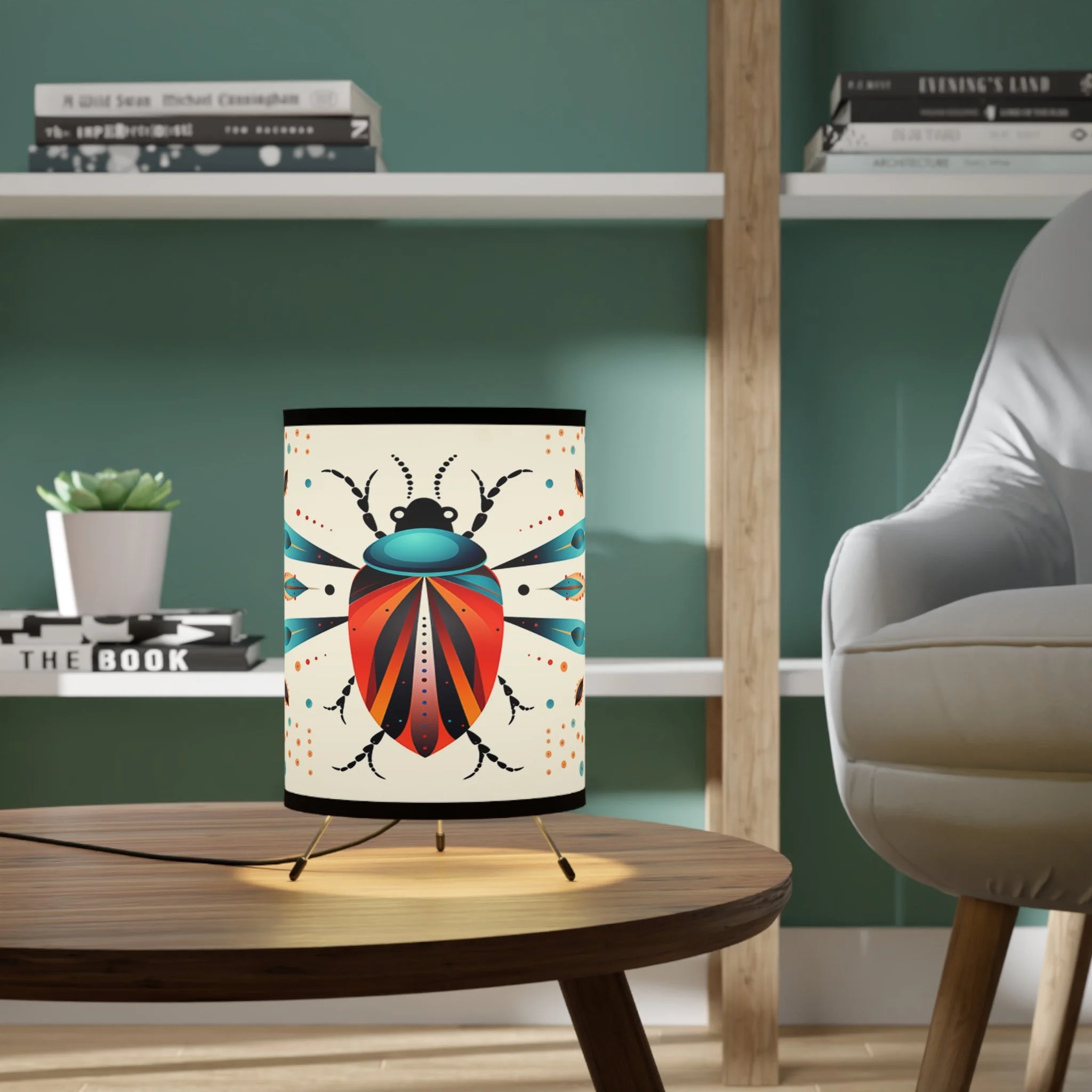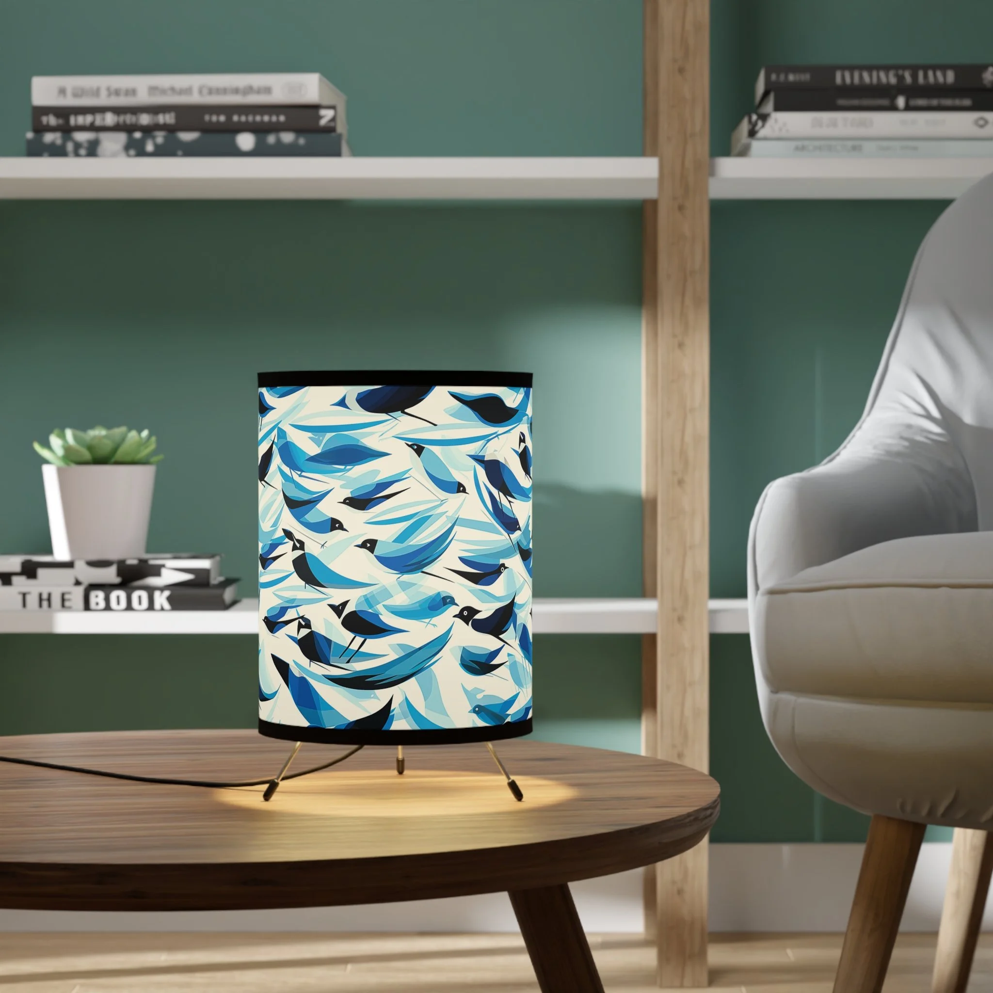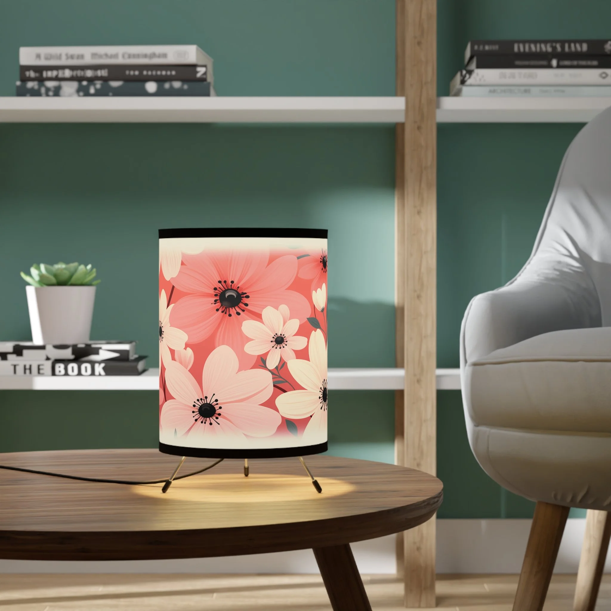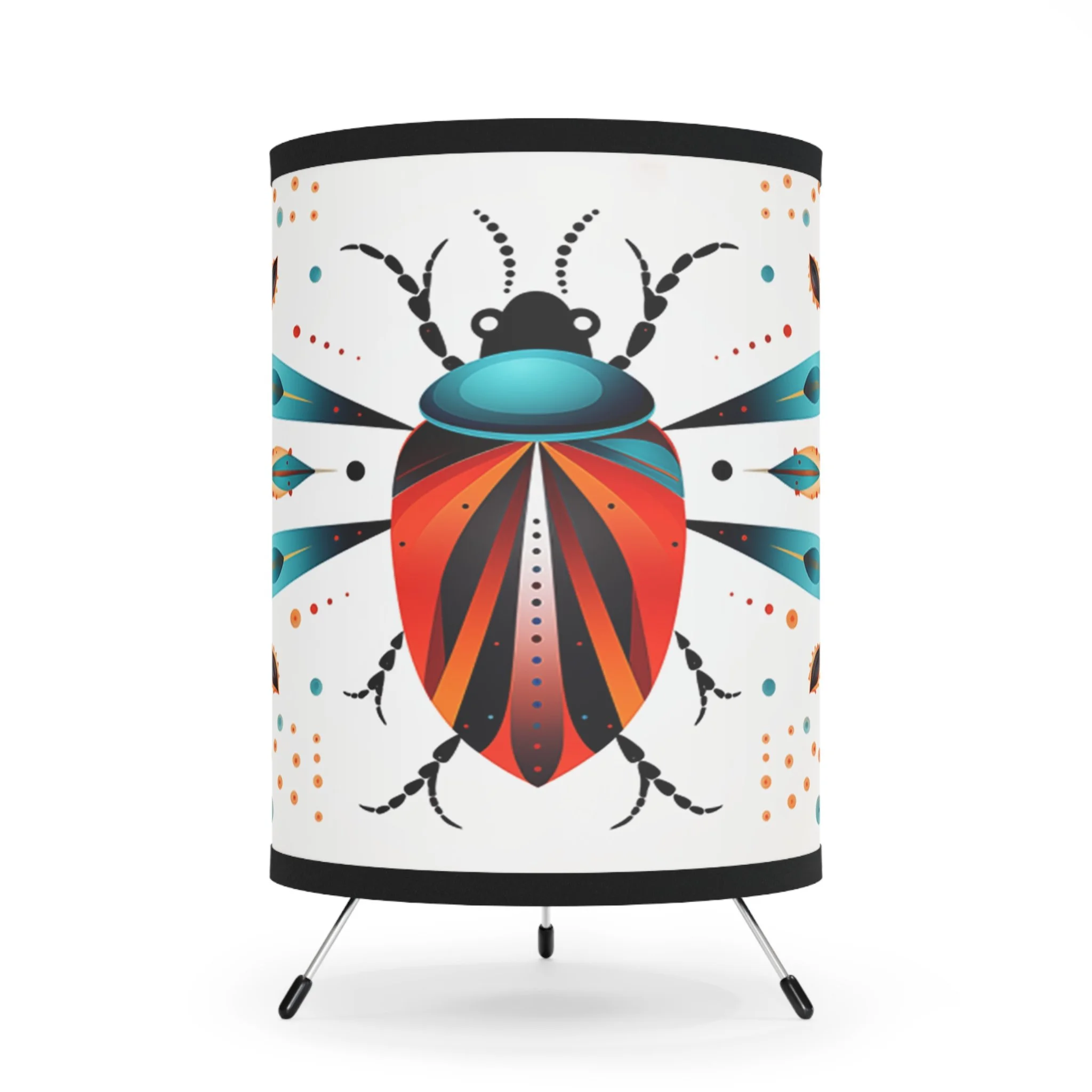 Add modern art and warm ambiance to any room with our tripod tabletop lamp featuring exclusive Design Motel artwork.